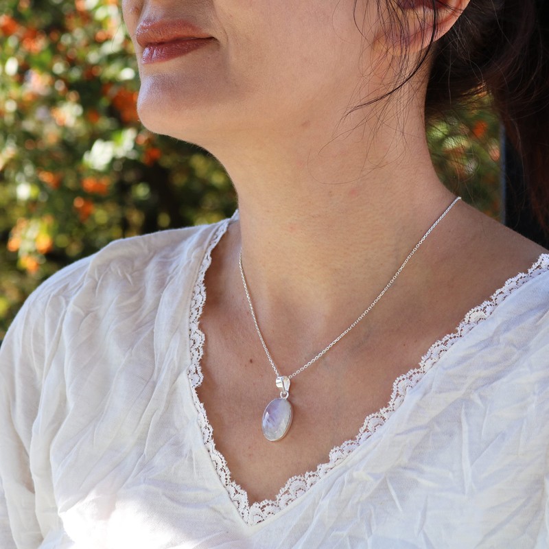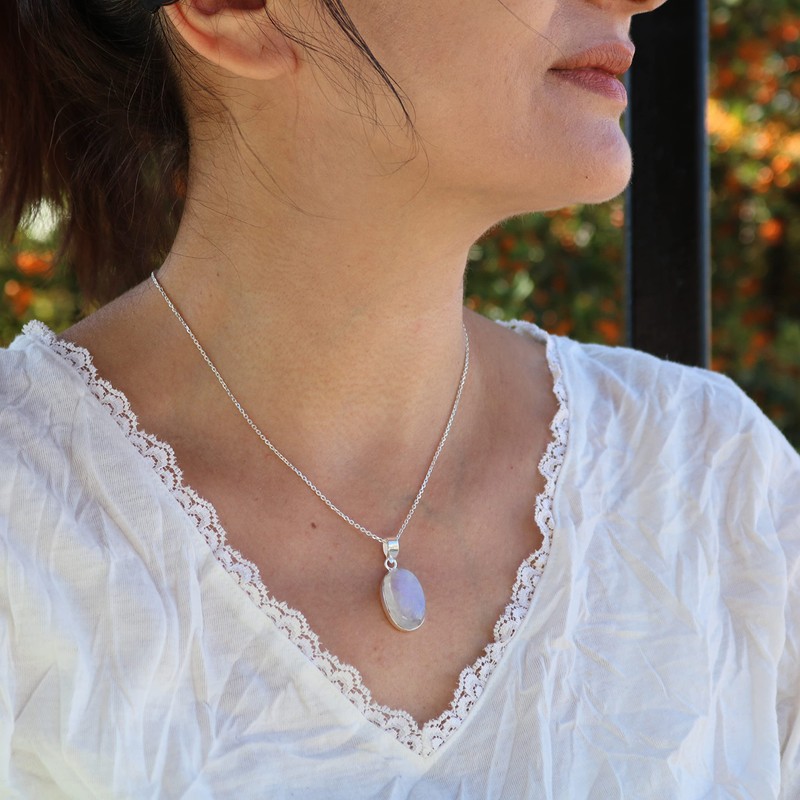 - QUALITY MATERIAL: 925 Sterling Silver Oval Pendant Necklace with Natural Moontone. MOONSTONE NECKLACE: Genuine Moonstone. Package includes 1 moonstone silver open-back frame pendant. Open-back frame allows the light to enter from the back of the gem.