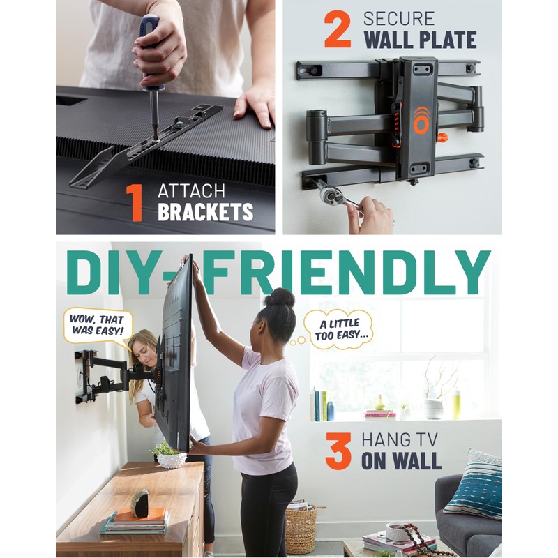 - Get your TV on the wall and ready for movie night. This smooth full motion mount works with screens up to 82" and is certified for safety.