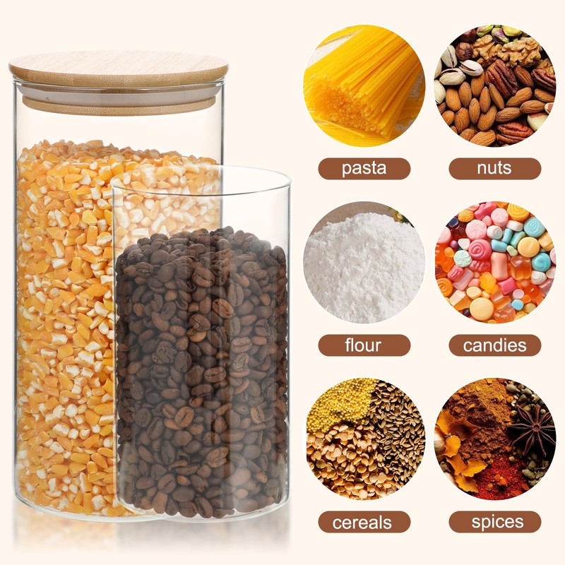 - 【Versatile Sizes for All Your Storage Needs】3pcs75oz & 2pcs 29oz & 2pcs 23oz& 2pcs16ozRound Glass jars, perfect for storing grains, pasta, nuts, spices, coffee beans, loose leaf tea, and more. Tailored to fit a variety of pantry and kitchen essentials.