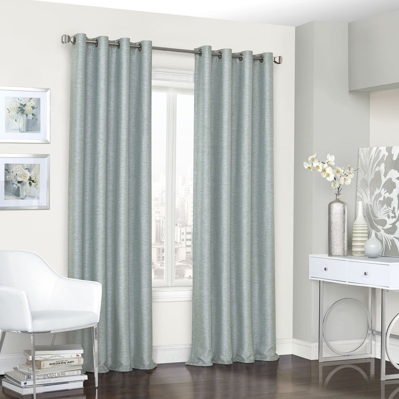 Find the perfect combination of fashion and function with the Eclipse presto blackout curtains. Eclipse offers a complete line of functional curtains that provide privacy, manage light, reduce noise, and help with energy savings, without sacrificing the latest looks in window fashion. These beautiful panels offer blackout benefits and feature a modern rustic aesthetic with a basket weave texture. Premium thermal lining gives this panel a rich hand and provides luxurious drivability. Each panel measures 52 inches wide in your choice of 63, 84, 95, or 108 inches long. 1.65 inch grommets are recommended with a 1 inch rod for maximum movement. Chocolate and ivory panels have antique bronze grommets. Grey and Spa panels have brushed nickel grommets. Curtain rod sold separately. 100Percent polyester, lined panel. Machine washable.