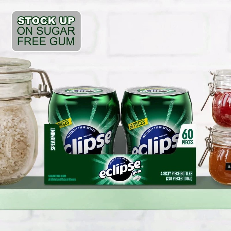 - Package includes 4 individual bottles of Eclipse Spearmint sugarfree chewing gum, 60 pieces in each