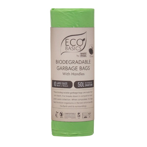 Eco Basics Biodegradable Garbage Bags with Handles – Large, 20 Bags, 52L, 83 x 64cm, Strong & Compostable Corn Starch Bags