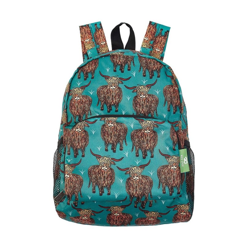 ECO CHIC Lightweight Foldable Water Resistant Mini Backpack Folds Into Pouch for Storage (Highland Cow Teal)