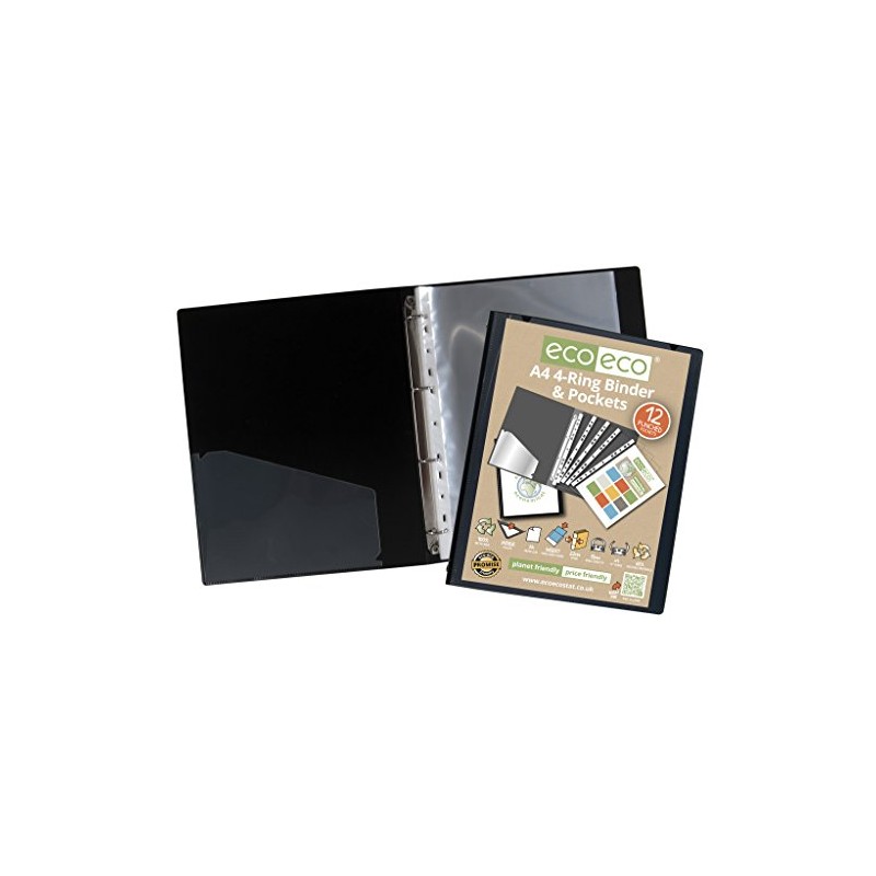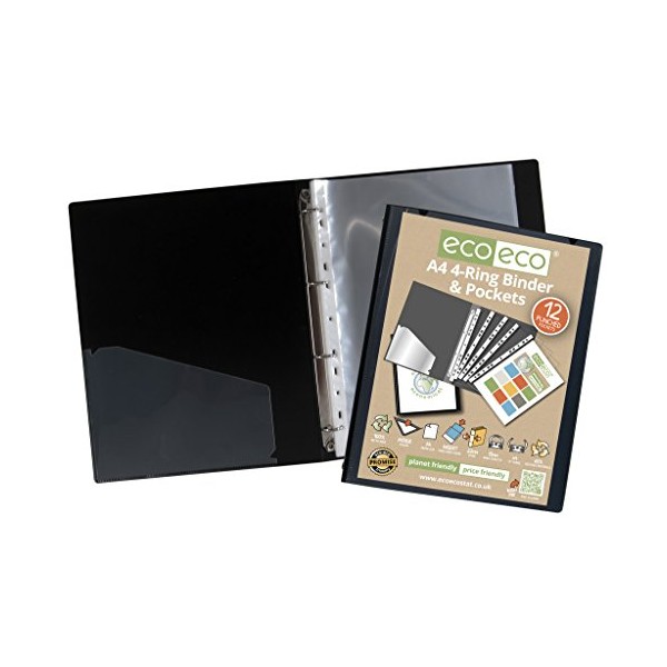 eco-eco A4 65% Recycled Strong Black Presentation Ring Binder + 12 Free Pockets