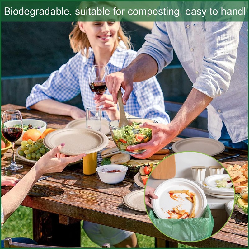 - Material: Biodegradable Compostable Disposable Plates is Made of 100% Sugarcane Fiber, a Sustainable, Renewable, and Biodegradable Material, A great Alternative to Traditional Paper,easy clean.