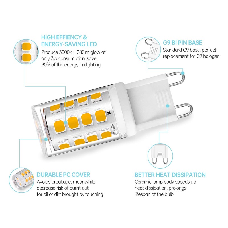 - 90% energy-saving – 3 W G9 LED lamp emits at 280 lm, which corresponds to 20 W / 28 W G9 halogen lamps; improved IC + LED chips, prevent visual flicker; immediately turn on within 0.5 s, no warm-up time