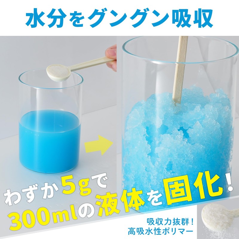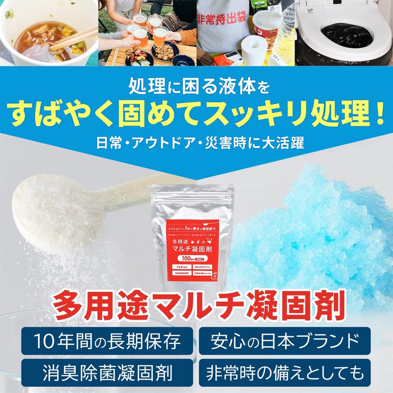 - ✅わずかスプーン1杯で液体を素早く固めて可燃ゴミとして処分できる多用途マルチ凝固剤です。普段の調理、インスタント食品や鍋などの残り汁を固めて処分したり、アウトドアやBBQで残った汁の処理にも使用できます。介護現場でも汚物処理や断水時、渋滞時、災害時の簡易トイレとしての使用にも。いつ発生するかわからない災害時に備えて、またアウトドアや日常の廃液処分などさまざまなシーンでも活躍します。非常時、交通渋滞時のための携帯トイレ用や、アウトドアや日常では食後の残り汁の処分にもご使用いただけます。使用後の処理も簡単で、液体の汚れや不快な臭いを優れた抗菌・消臭力ですばやく封じ込めることができます。
