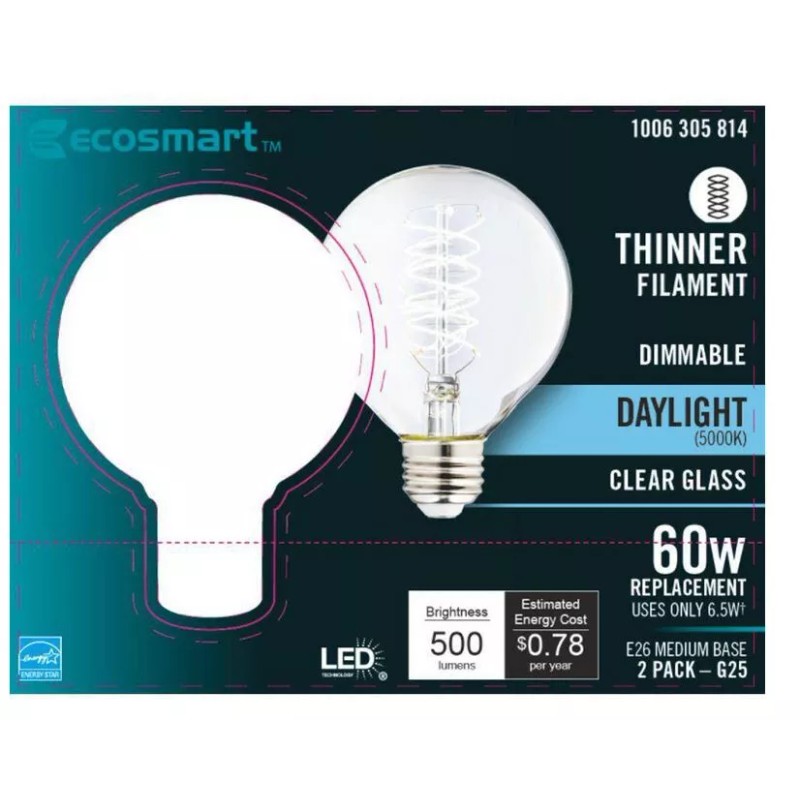 Enhance your home with the EcoSmart G25 LED Vintage Edison Filament Bulb. This bulb can be used to replace a 60-Watt bulb. The Daylight LED light has 6.5-Watt of power and emits 500 Lumens for up to 15,000 life hours. The daylight color temperature is essential for creating a bright, crisp feel throughout your home. It is recommended for work spaces, living rooms, kitchens, bathrooms and bedrooms. Customize your lighting style with this dimmable bulb by adjusting your light from daylight to a relaxing low, light. The decorative G25 bulb is designed for indoor or outdoor fixtures and features a medium E26 base. The energy-efficient LED bulbs offer you an estimated energy cost of $0.78 per bulb over the course of the bulb's life. Create a unique style in your living space with this Vintage Edison LED bulb today.
