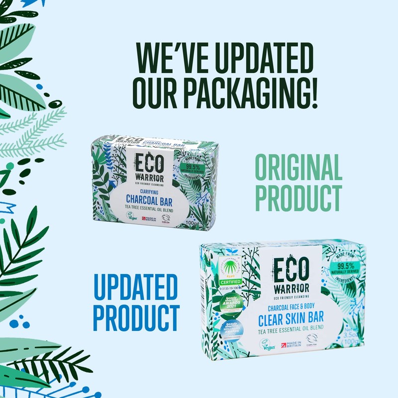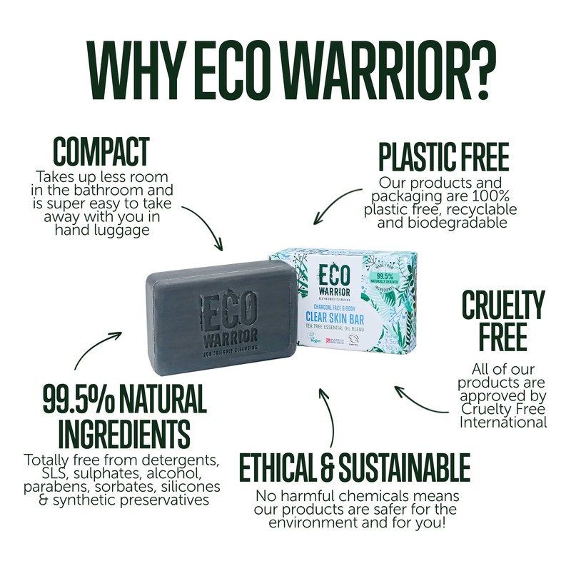 Eco Warrior Charcoal Clear Skin Soap Bar - Vegan, Cruelty Free, No SLS or Parabens, Whole Body Soap, Moisturising Charcoal, Grapeseed and Anti Bacterial Tea Tree Essential Oil, Eco Friendly Soap 100g