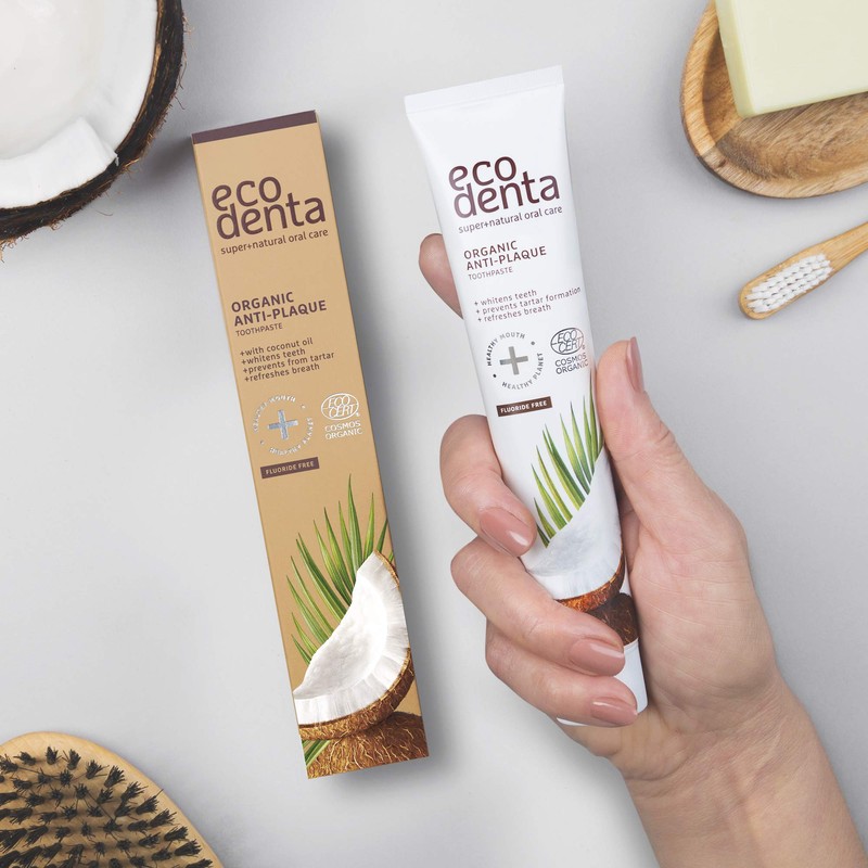 - Ecodenta Toothpaste Fluoride Free Anti Plaque Certified Organic Toothpaste 75ml With Natural Ingredients Coconut Oil Aloe Vera Juice Xylitol Peppermint Essential Oil