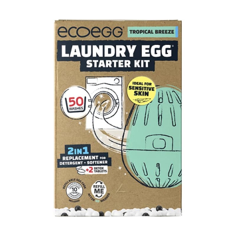 Introducing the ECOEGG Laundry Egg Starter Kit, featuring a tropical breeze scent and enough detergent for 50 washes. Made with eco-friendly materials, this kit offers a gentle and effective way to clean your clothes, leaving them smelling fresh and reducing waste. Save money and the environment with this all-in-one laundry solution.