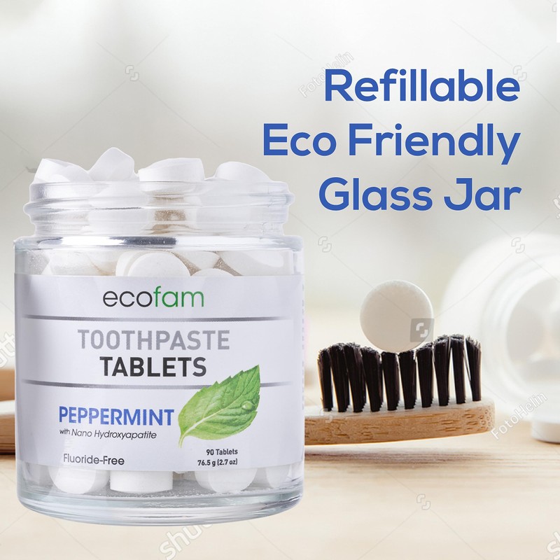 Ecofam Chewable Xylitol Toothpaste Tablets - 90 Natural Whitening Paste Tabs - Glass Jar - Fluoride-Free - Remineralizing Nano Hydroxyapatite - SLS Free - Made in The USA - (Peppermint 3 Pack)