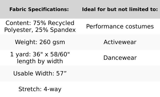 Ecoflex is a 4-way stretch Double-Brushed Compression Interlock Spandex with Recycled Polyester. This fabric is ideal for performance costumes and athleisure fashion. It also offers superior shape and elastic recovery, making it perfect for any project that requires a quality fabric with a beautiful drape. Ecoflex is lightweight and breathable, offering enhanced comfort and durability without sacrificing on quality.