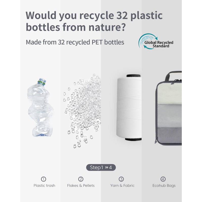 - 【Your Sustainable Travel Companion】: Our ECOHUB Packing Cubes are made from materials equivalent to 32 recycled plastic PET bottles and are GRS-certified. They're machine washable, making it easy to maintain their appearance. Designed to fit carry-ons, backpacks, and more, these cubes are perfect for business trips, vacations, and home storage. For any inquiries, feel free to contact us.