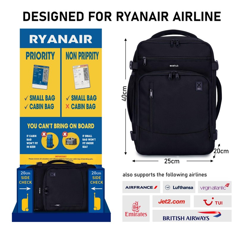 - Dimensions and capacity: the ECOHUB hand luggage fits the maximum baggage allowance for Ryanairsflug. The travel bag under seat measures 40 x 20 x 25 cm. With a capacity of 20 litres, its weight is only 570 g. Besides Ryanair, the bag is also perfect for Easyjet, British Airways, Etihad, Emirates etc.