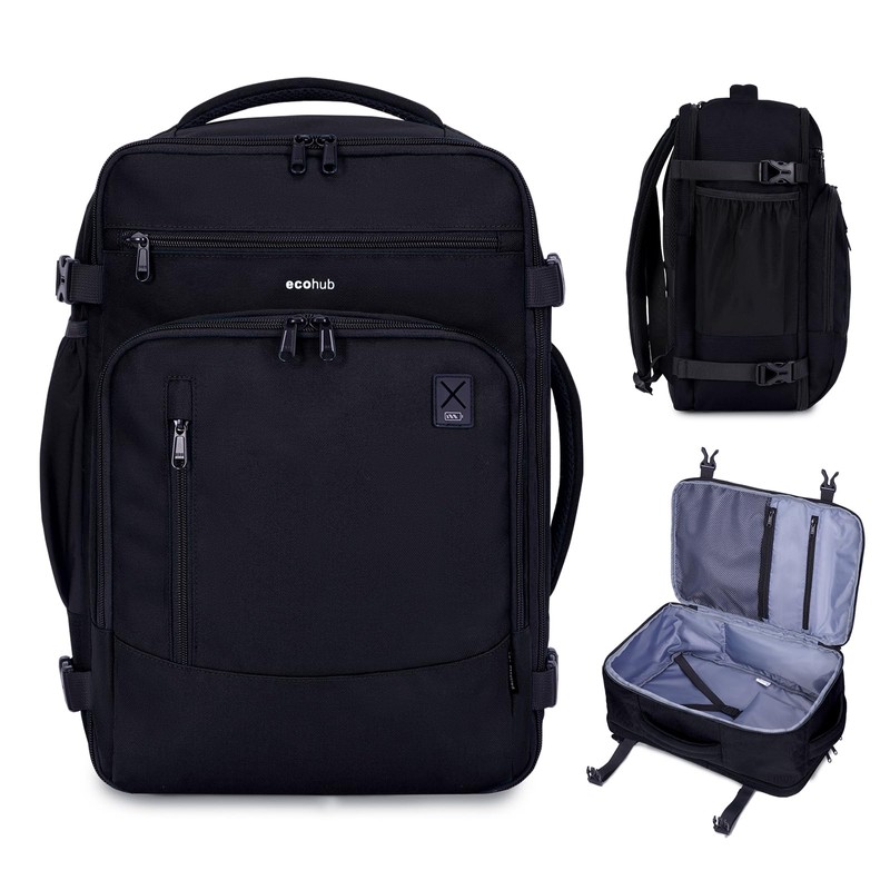 ECOHUB Backpack 40 x 20 x 25 cm for Ryanair Aeroplane Travel Backpack Hand Luggage Laptop Daypacks PET Recycled Environmentally Friendly Backpack Waterproof Under Seat 20 L Women Small, Slim Black