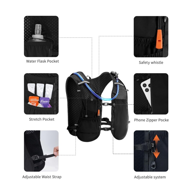 • 【Details】 Extended adjustable chest and waist straps allow the running vest to fit most men and women.Reflective trim and whistle design for safety. The front pocket with a drawstring tightening system to prevent soft flasks sloshing, bouncing, or rattling during your run.
