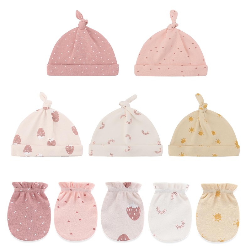 - Package: 5 baby boys girls cotton hats and 5 anti-scratch gloves set