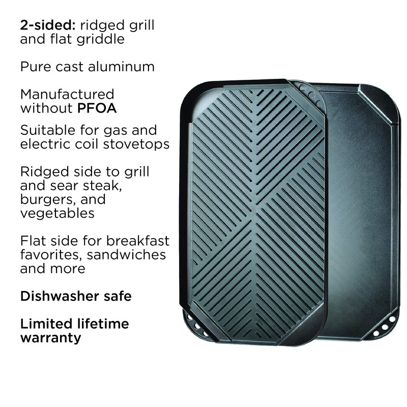 - VERSATILE REVERSIBLE GRILL AND GRIDDLE- Cook large meals on either side of this reversible grill/griddle. Use the ribbed side for grilled foods, like steaks or chicken, or use the flat griddle side for a variety of your favorite foods like pancakes, bacon and eggs