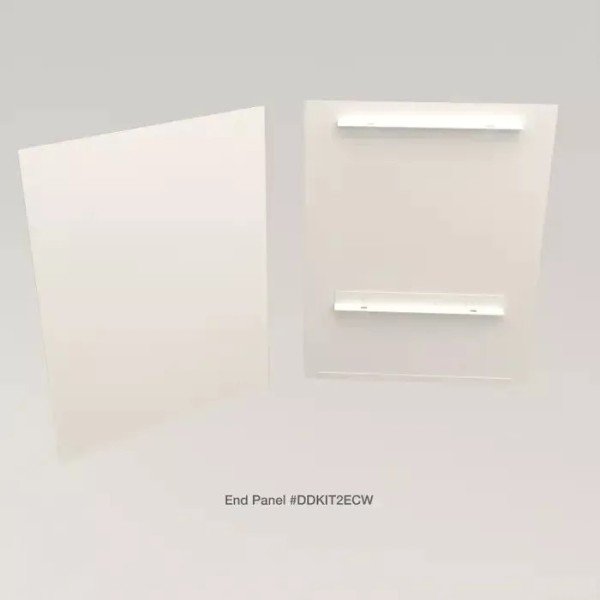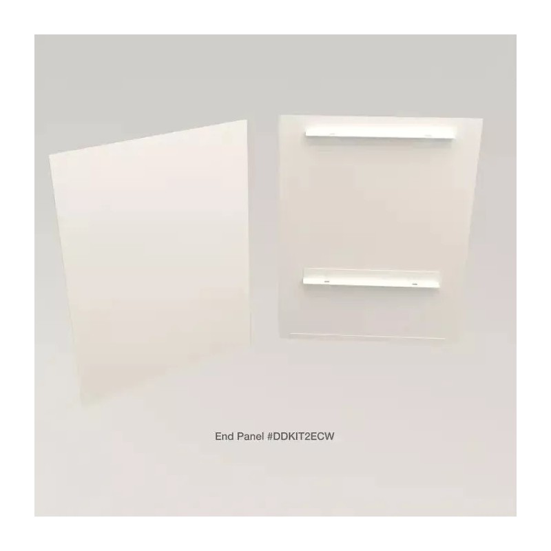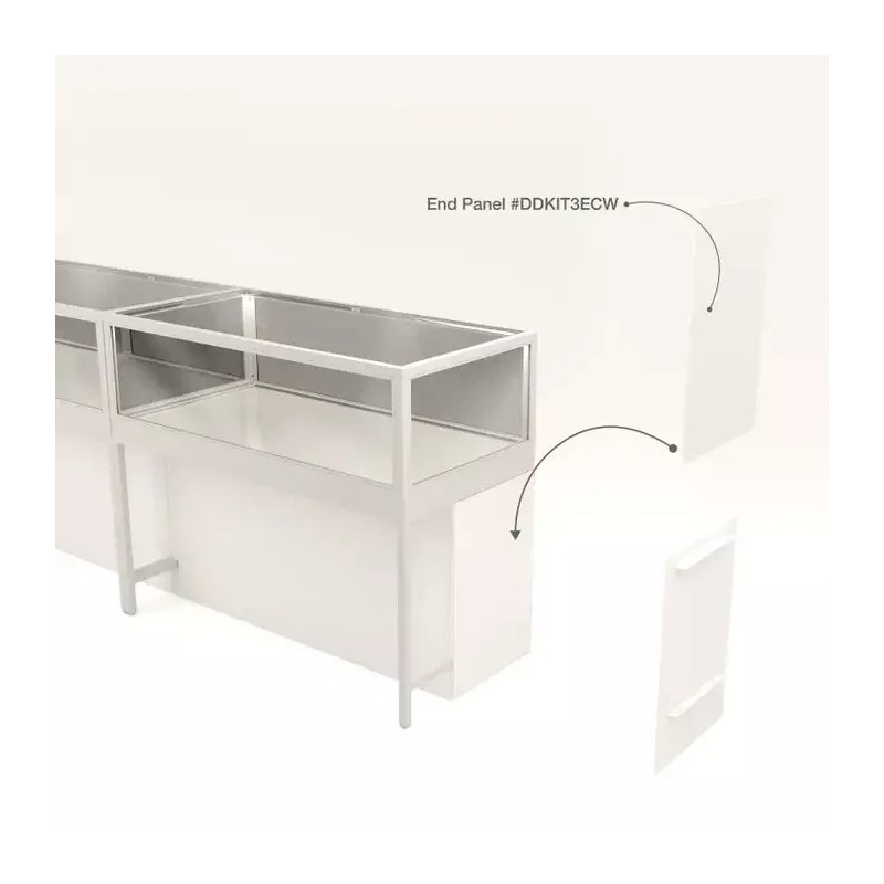 The end panel finished in white easily mounts to the square tubing base of the Deluxe Glass Showcase (DDKIT3W). Showcases can use two end panels if needed, usually you only need them for one end of the last showcase in a run of showcases. It works on either the left side or right side of the showcase. Includes all mounting hardware and easily mounts to showcase base. If installed with a Front Panel (DDKIT3PPW), please install the front panel first.