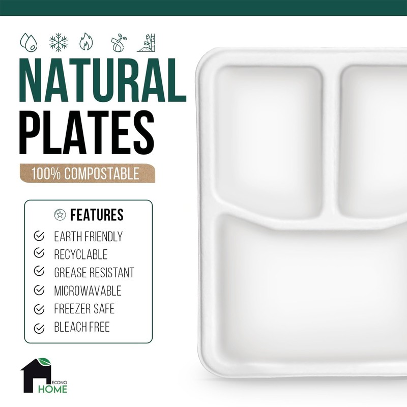 EconoHome Disposable Plates with 3 Compartments - Eco-Conscious Bagasse Sugarcane Disposable Plates - Microwave, Refrigerator-Safe - Heavy Duty Paper Plates for Dinner Party Supplies - Case of 600