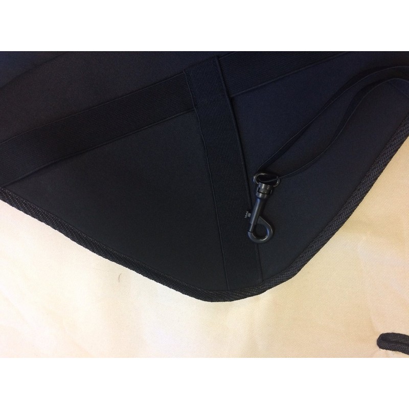 - Back seat cover is equipped with elastic straps and loops to secure into your seats. It also has a safety harness feature with seatbelt attachments.