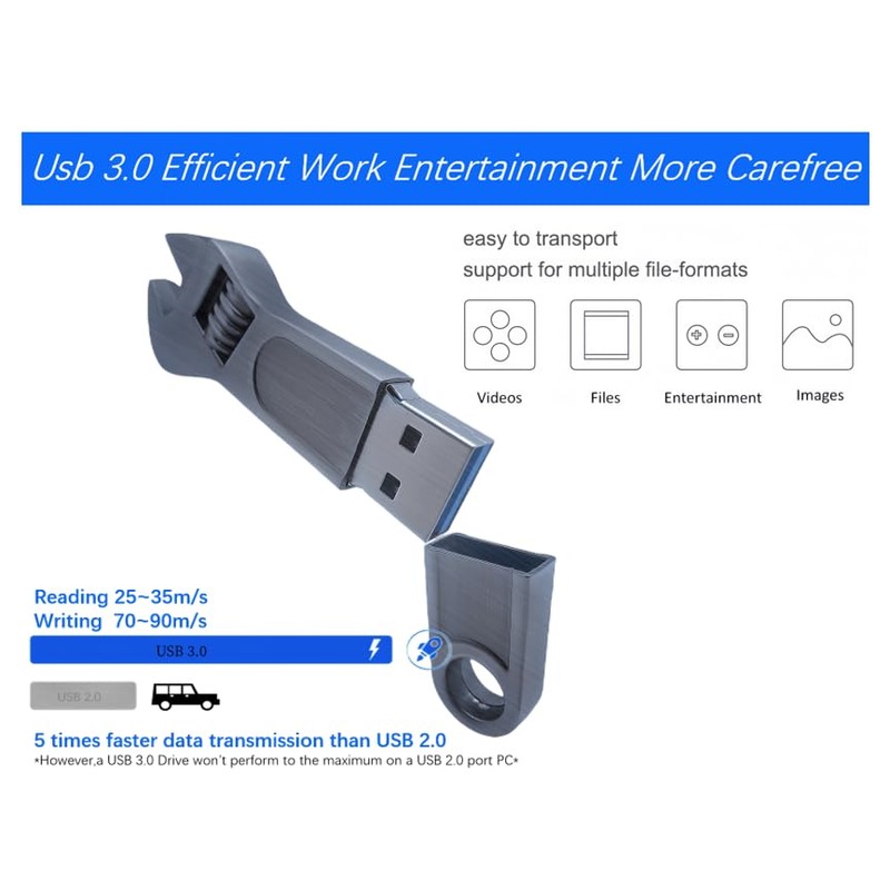 - Product size 80*20*8mm, net weight 41g. Strong metal wrench shaped memory stick, 128GB usb 3.0 flash drive, novelty and interesting thumb drives for data storage.