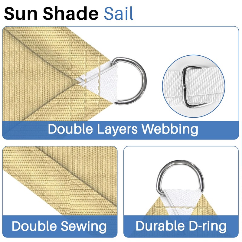 - HIGH-QUALITY FABRIC: Our sun shade sail is made of high-density polyethylene, durable and strong. The fabric is cut from a complete roll and finished with a double strong stitching seam.