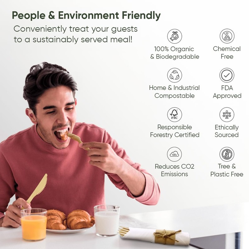 - DISPOSABLE, BUT SUSTAINABLE: Unlike plastic cutlery, our disposable bamboo cutlery is fully biodegradable and won’t sit in landfills for years; we use FSC-certified packaging and PLANT A TREE / FEED A CHILD with each order to give back to the planet.