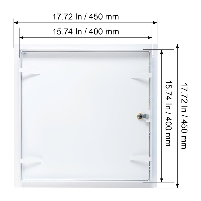 - Outer panel dimensions: 17.71" x 17.71" Inch. Door opening dimensions: 15.74" x 15.74" Inch. Color: White, epoxy coating. Paintable surface, although key hole must be covered when paint is applied.