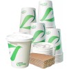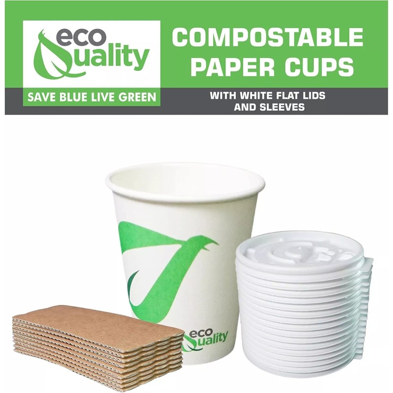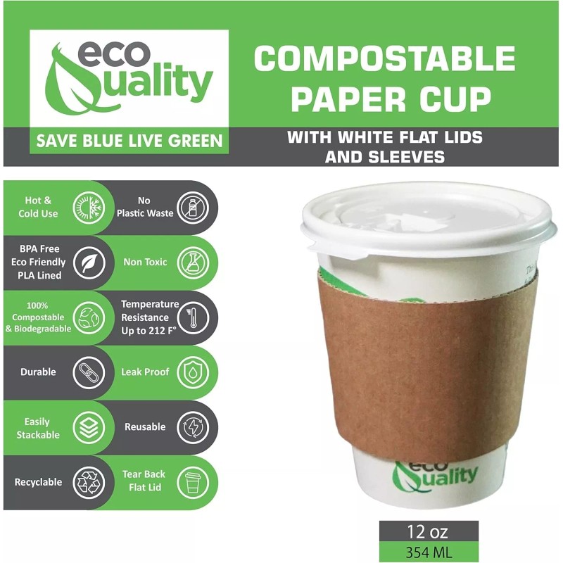 EcoQuality 12oz Compostable Paper Cups with White Flat Lids and Sleeves 400pcs