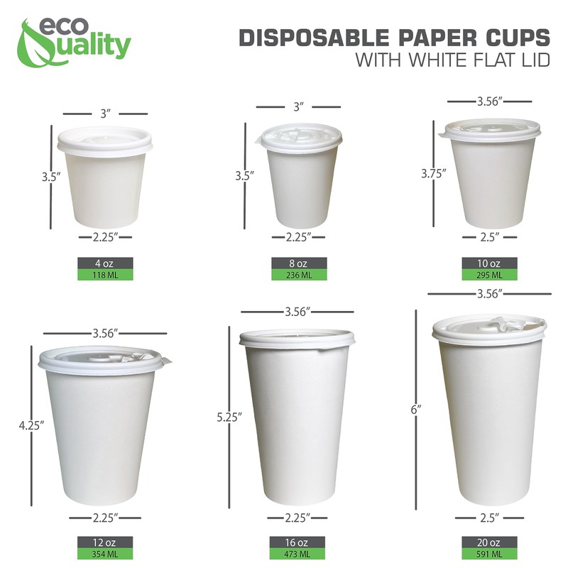• CONVENIENCE: Our white 20oz coffee cups with rolled rims are made for comfortable drinking. EcoQuality disposable paper cups with lids can be used with any hot or cold drinks and make great for serving coffee, tea, espresso and hot chocolate. Disposable hot paper cups can then be thrown directly into your recycling bin after each use-saving time and cleaning!