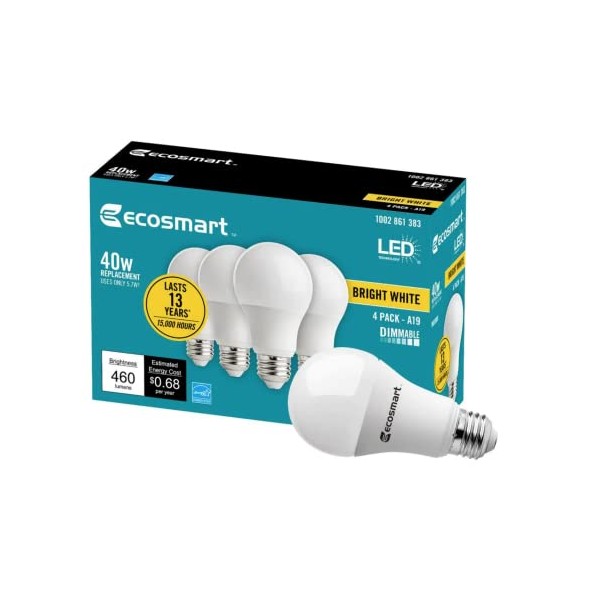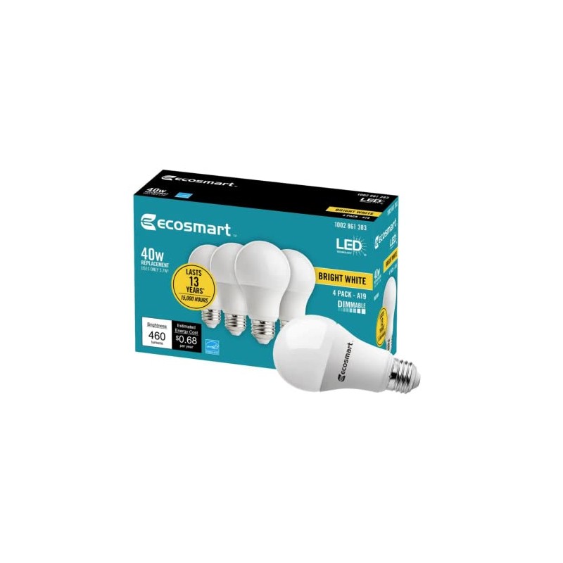EcoSmart 40-Watt Equivalent A19 Dimmable Energy Star LED Light Bulb Bright White (4-Pack)