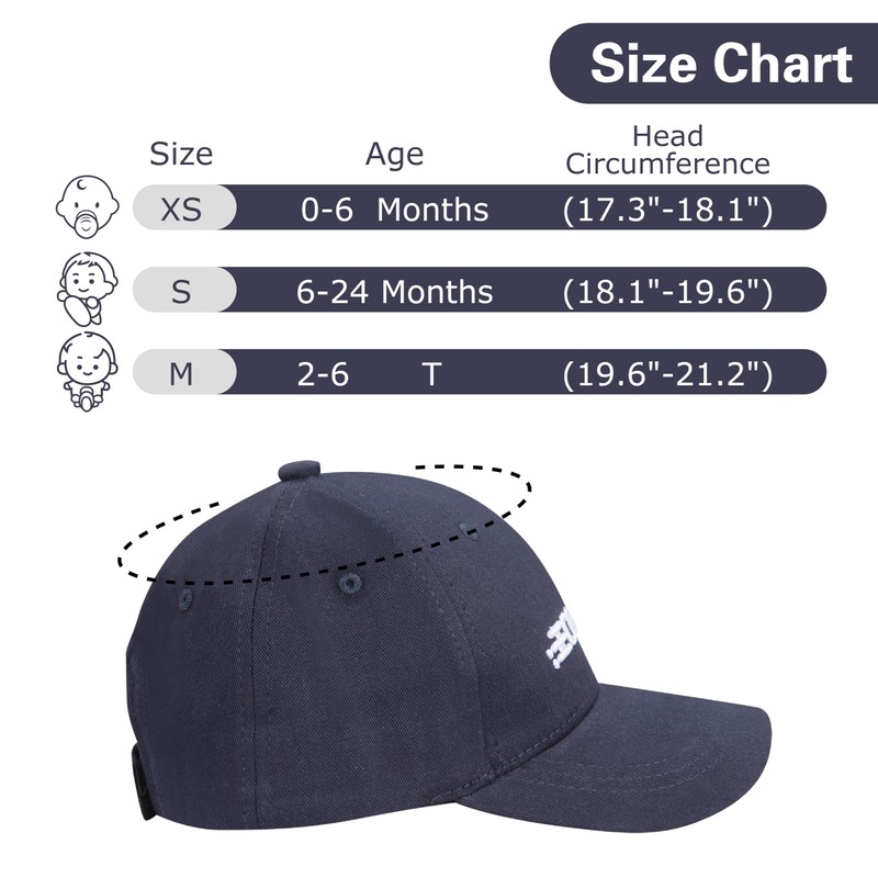 - 【Baby baseball cap size】Newborn baseball cap 0-6 Months (17.3"-18.1"),infant baseball cap 6-24 Months (18.1"-19.6"),toddler baseball cap 2-6 T (19.6"-21.2"), If the baby is at the critical size range, it is recommended to choose one size larger to reserve space for growth.
