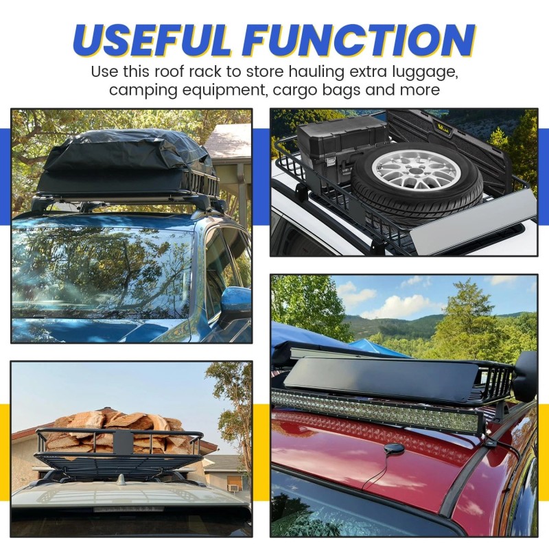 Useful function: Use this roof rack to store hauling extra luggage, camping equipment, cargo bags and more. Built for the outdoor adventurers lifestyle. Easy to install with 4 universal U-bolts. The bottom metal bars and side rails provide plenty of tie down points. A steel wind fairing is also included. Carry big loads and mount accessories directly to the crossbars or straight bars of this roof rack cargo basket