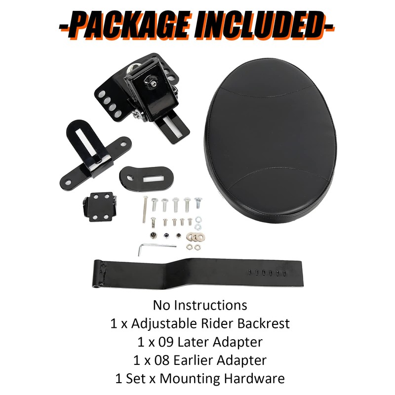 • Package Included: 1 x Adjustable Rider Backrest+1 x 09 UP Adapter+1 x 08 Earlier Adapter+1 Set Mounting Hardware.
