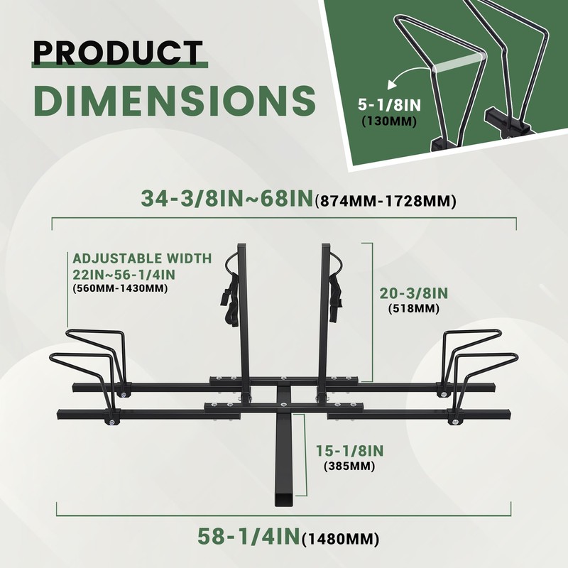 - Overall Dimensions: Measuring 59" x 23.5" x 23.5", this bike rack can hold up to 2 bikes. You have the flexibility to position the front end of the bicycles on either the left or right side