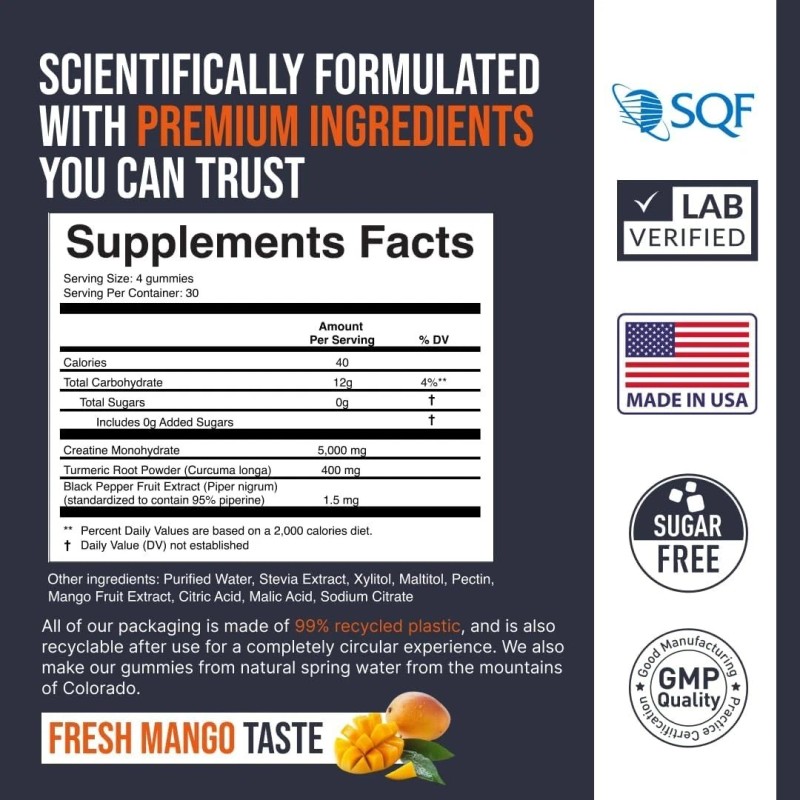 Creatine Monohydrate Gummies 5000mg – Sugar-Free Vegan Mango Flavor, 120 Chews