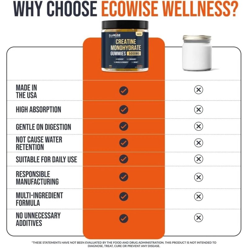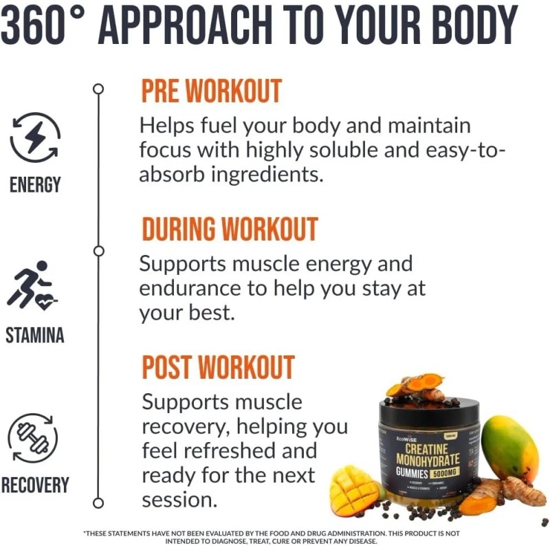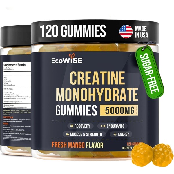 EcoWise Wellness Creatine Monohydrate Gummies 5000mg – Sugar-Free, Vegan, Mango Flavor, 120 Chews