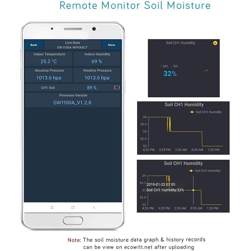- 🍀🍀【NOTE BEFORE PURCHASE】🍀🍀This soil moisture sensor is only an accessory of Ecowitt soil testing system. You could not get the soil moisture value when separately using this device, you can get the accurate result from our free app Ecowitt or Ecowitt Weather Server after connecting with the GW1100 gateway and wifi configuration. Ecowitt GW1100 gateway is sold seperately.