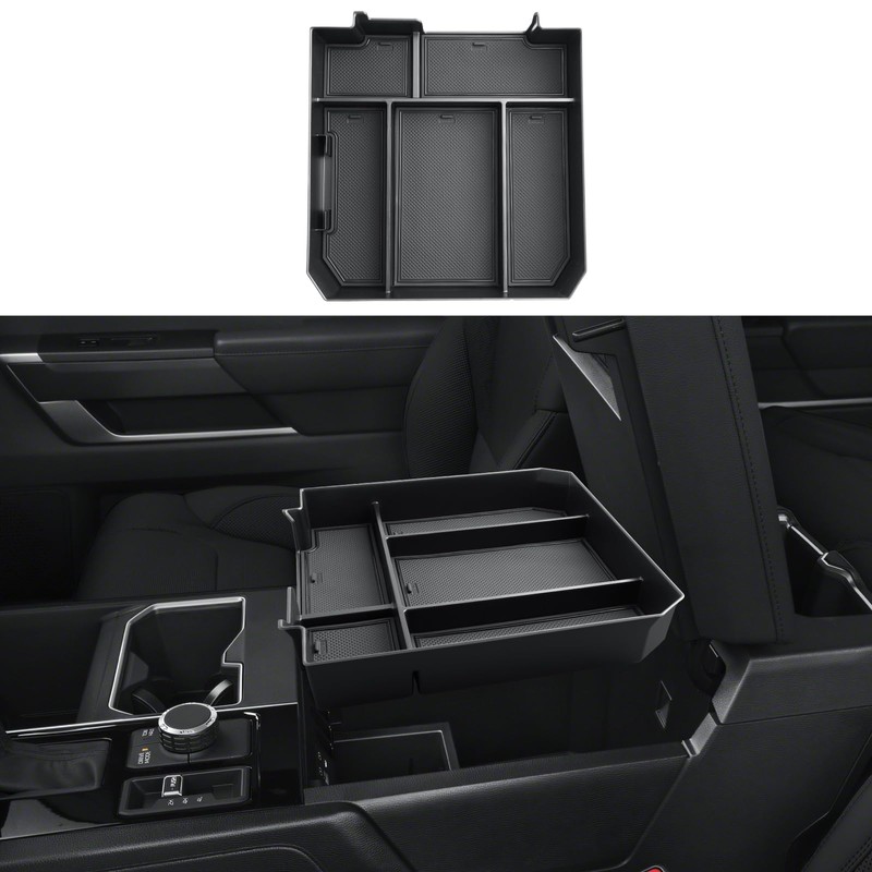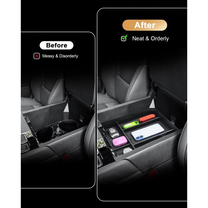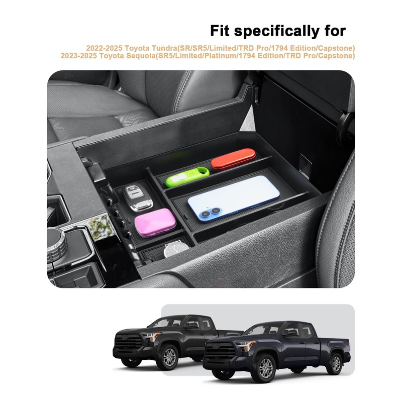 - [Custom-Molded Storage Boxes] The custom-molded center console organizer is specially designed for optimal space usage. These precise designs offer ample storage and organizational options for items like phones, keys, and cards, keeping your new Tundra tidy and clutter-free.