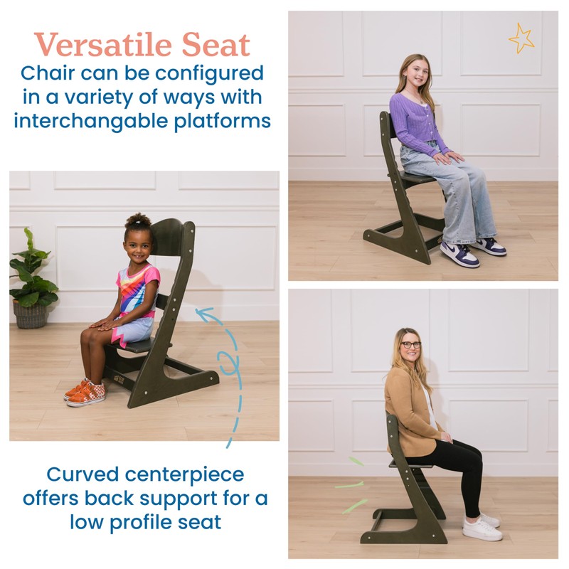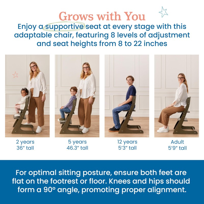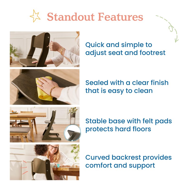 - Hardwood Chair: Adjustable chair with a modern design that elevates children to the table for meals and activities; features an adaptable seat and footrest for growth from toddler, teen, to adult
