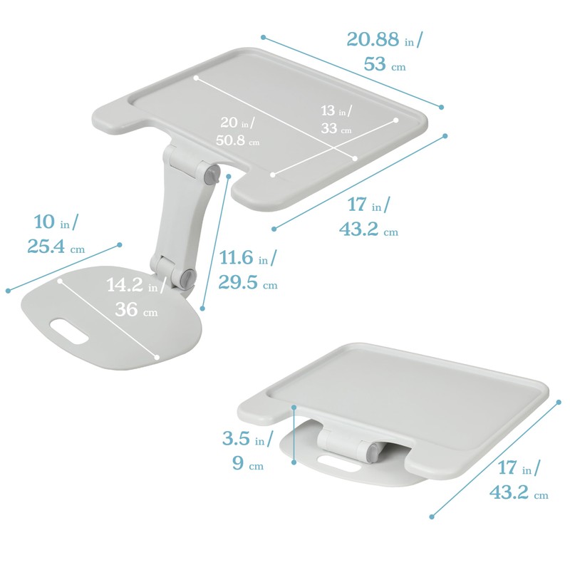 - Product Dimensions: The portable desk’s overall measurement is 20.88” W x 26.25” D x 11.6” H; folded item measures 20.88” W x 17” D x 3.5” H; 10 lbs weight capacity; patent pending design