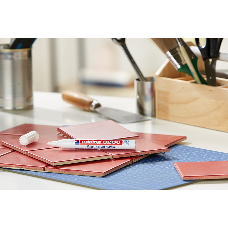 Edding 8200 grout marker Special Care and Repair at home. Paint Marker Pen for coloured repair bare Sanitärfugen, e.g. in the bathroom and kitchen. Odourless ink with no added xylene/toluene. Very water-resistant, highly opaque ink, non-fading and quick to dry. Water based pigment ink. Bullet tip. Plastic barrel and plastic cap in the same colour as the ink. Thickness: 2 - 3/8 (4 mm) wide colour available.