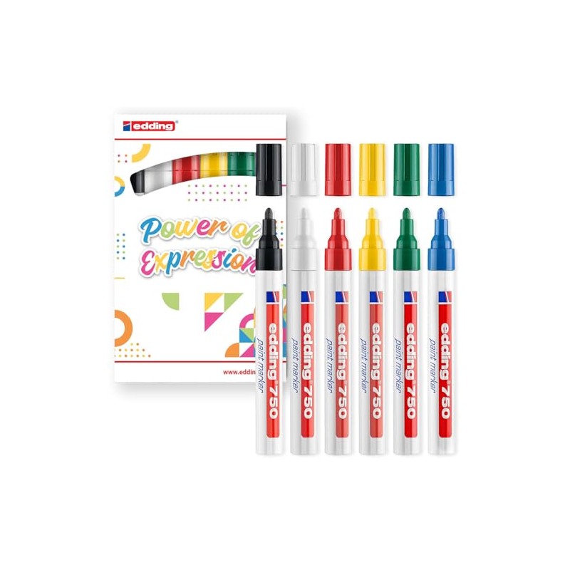edding 750 gloss paint marker - basic colours - 6 paint markers - round tip 2-4 mm - paint pen for glass, pebbles, wood, plastic, paper - waterproof, high coverage
