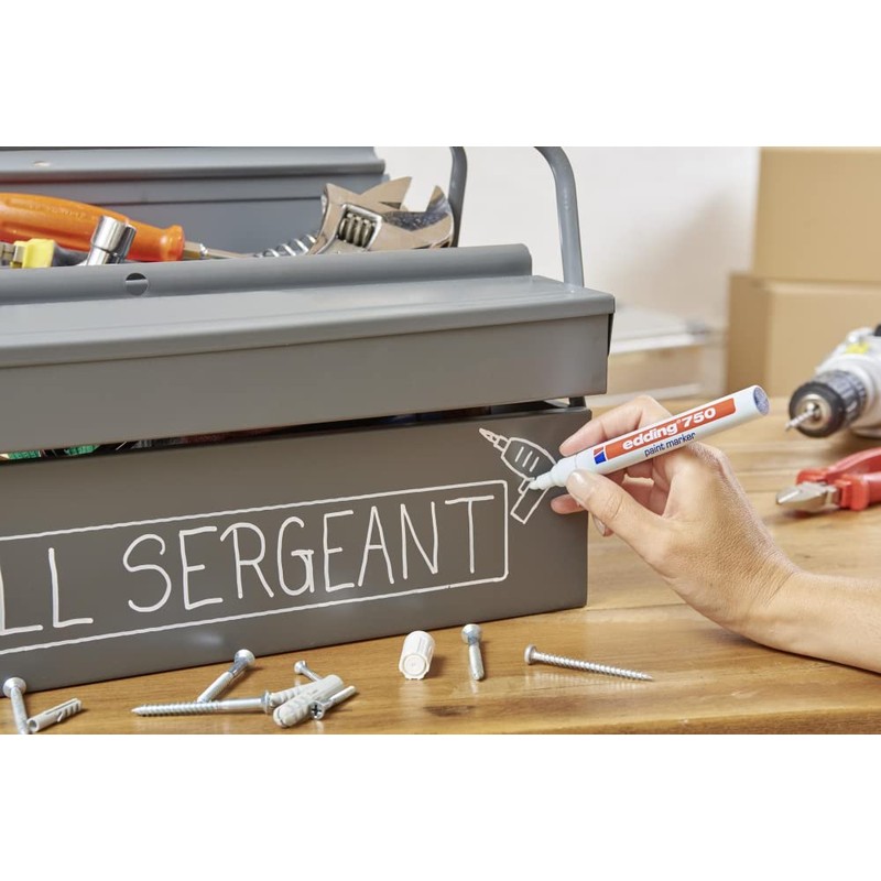 - Der edding 750 Lackmarker ist in 14 Farben erhältlich; passende Ersatzspitzen vorhanden; weitere Strichbreiten als edding 751 und edding 780 erhältlich