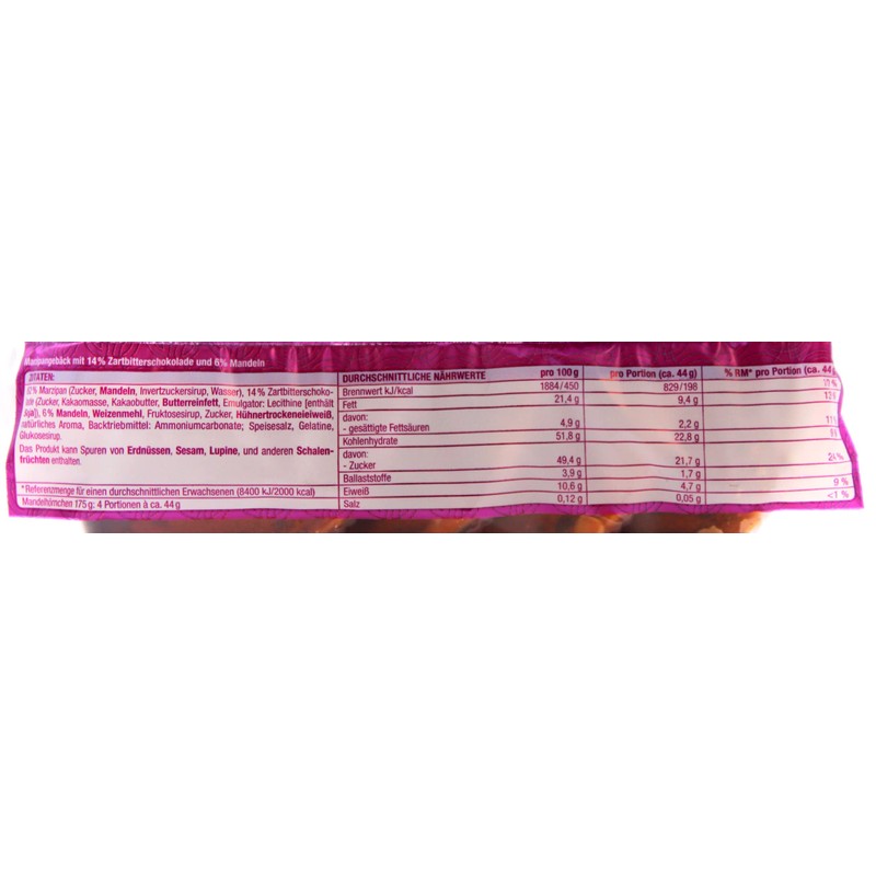 - Marzipan pastry with 14% dark chocolate and 6% almonds.