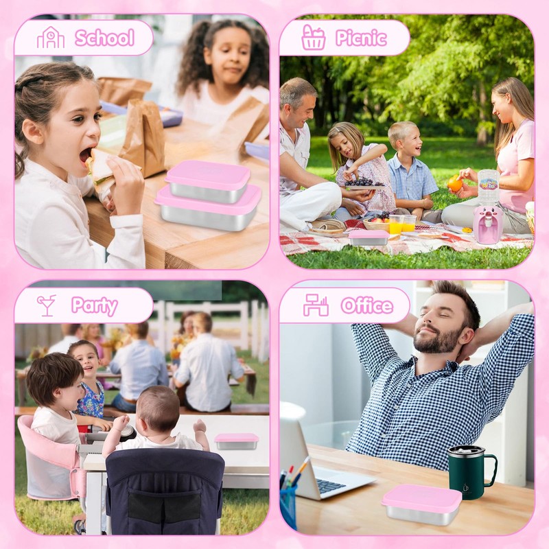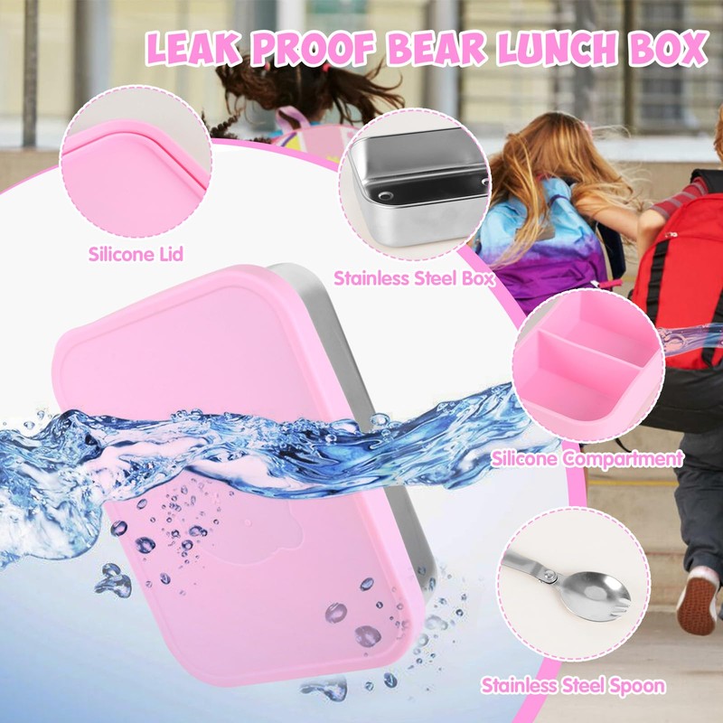 Edelstahl Kinder Brotdose mit Silikondeckel, Brotdose mit Fächern 1 Löffel Edelstahl, BPA Frei Bento Box, Auslaufsichere Snackbox Schule Kindergarten Ausflug, Frühstücksbox Kinder, Spülmaschinenfest
