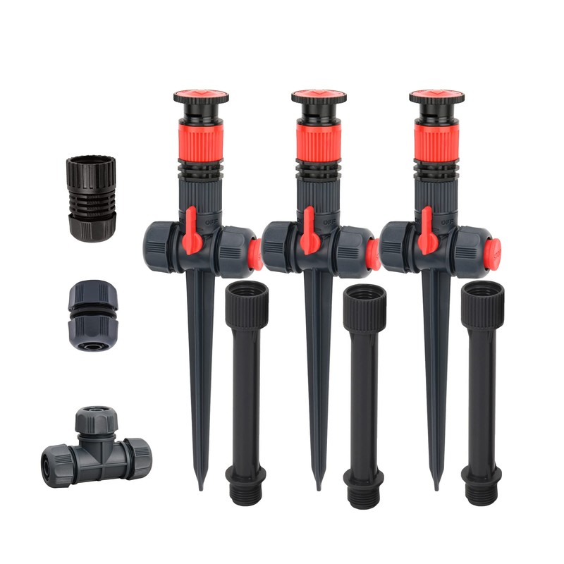 • Three multi-adjustable sprinklers feature precise controls to adjust the spray angle, spray direction and water flow without moving the spikes
