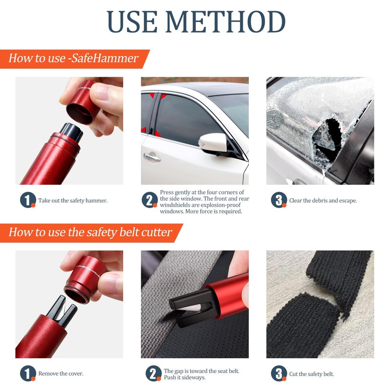 - 🧰【EMERGENCY ESCAPE TOOL】Car glass breaker can be used in a variety of situations, such as rollover, electrical system failure, car fire, flooding and so on. If the car is submerged, the electrical system will be short out and it will not be possible to open the doors or roll down the windows. The car safety hammer is not afraid of water pressure interference, protecting you to get out of your vehicle quickly in underwater, don't be a helpless victim in a car accident.